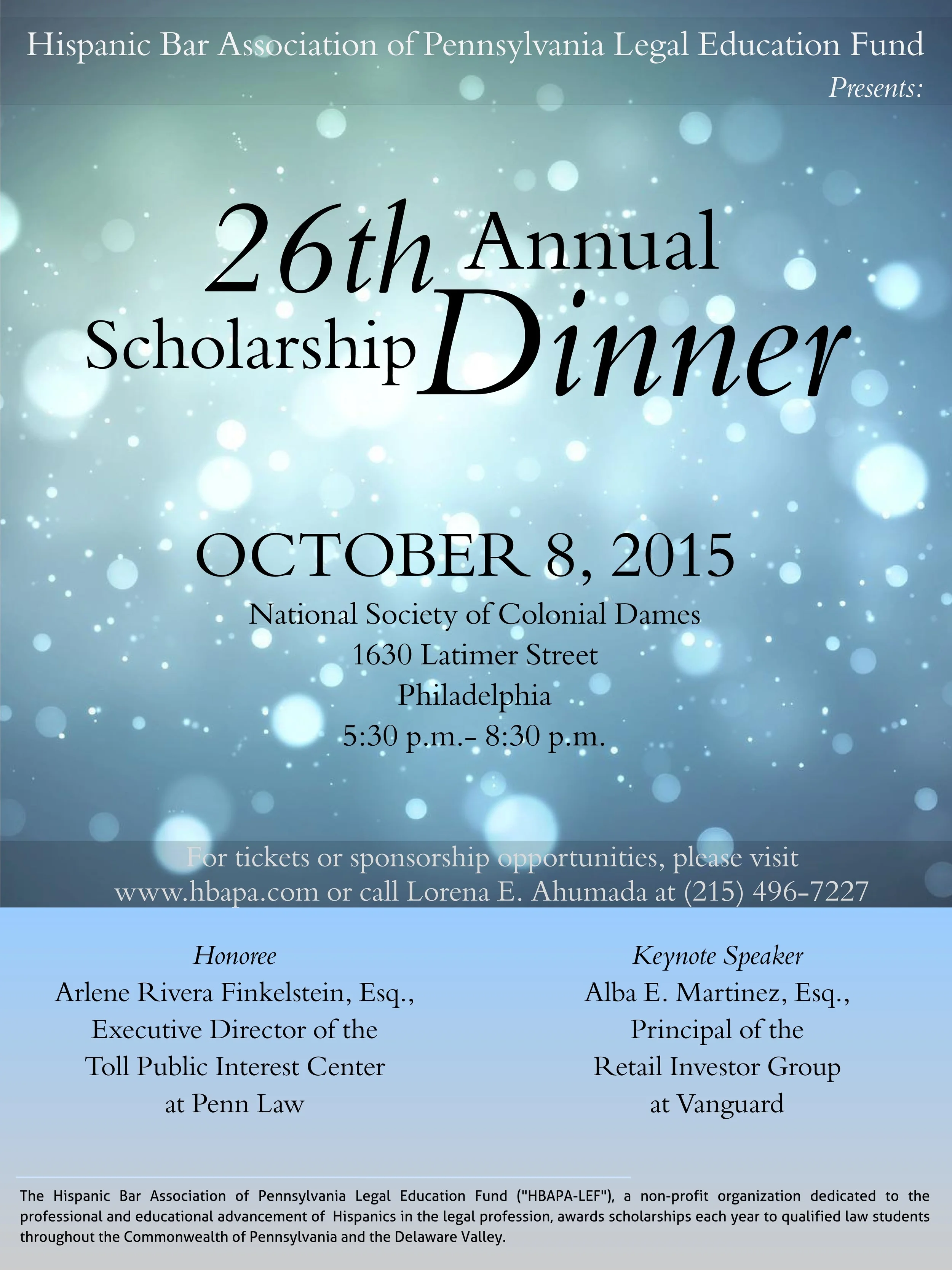Don't Forget to Buy Your Tickets! Hispanic Bar Association PennsylvaniaSeptember 14, 2015 Facebook0 Twitter LinkedIn0 Tumblr 0 Likes