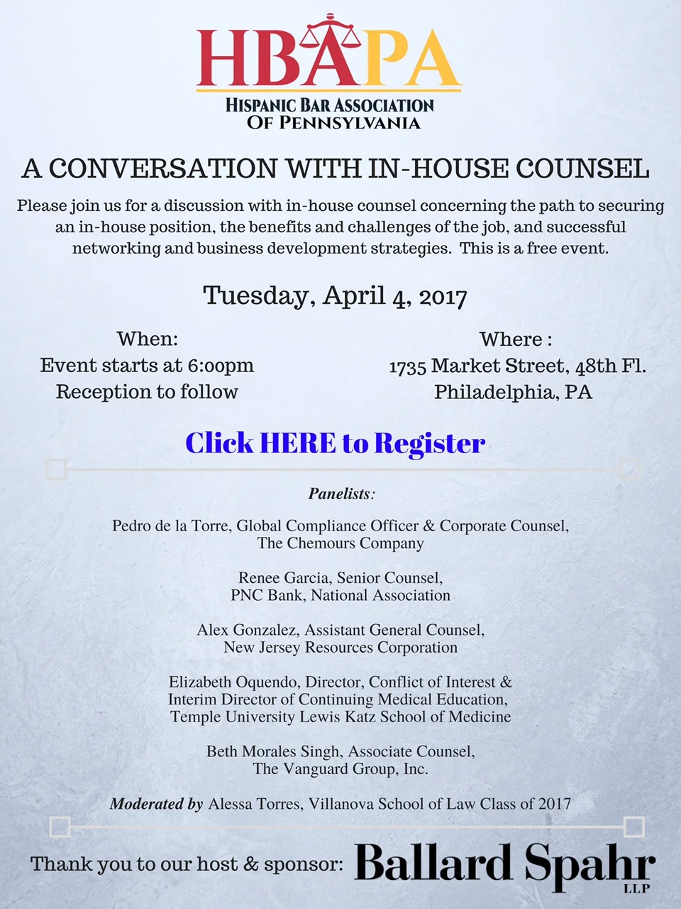 In-House Counsel Panel Hispanic Bar Association PennsylvaniaMarch 20, 2017 Facebook0 Twitter LinkedIn0 Tumblr 0 Likes