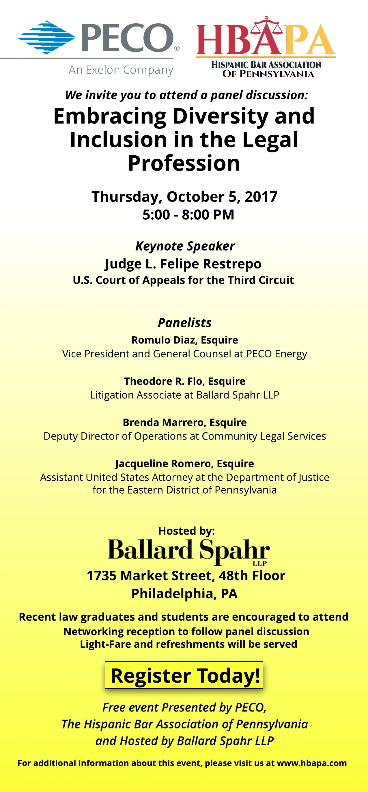 Celebrate Hispanic Heritage October 5, 2017 HBAPA & PECO Present: "Embracing Diversity and Inclusion in the Legal Profession." Hispanic Bar Association PennsylvaniaSeptember 29, 2017 Facebook0 Twitter LinkedIn0 Tumblr 0 Likes