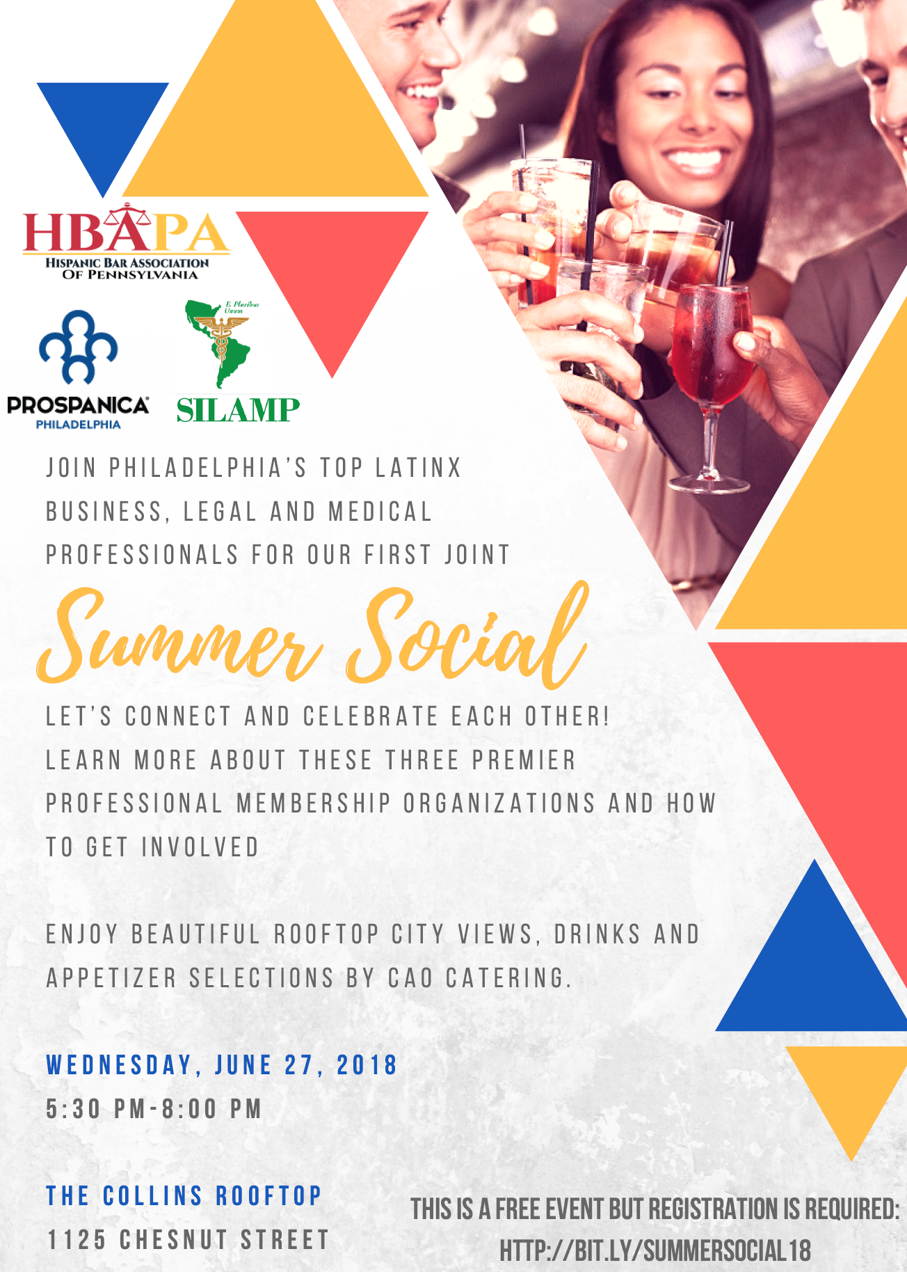 Event Update Update: Tonight’s event is on RAIN OR SHINE!Join the HBA, Prospanica Philadelphia and SILAMP (Society of Iberolatino Medical Professionals) for our first mix and mingle summer happy hour - June 27! Hispanic Bar Association PennsylvaniaJune 27, 2018 Facebook0 Twitter LinkedIn0 Tumblr 0 Likes